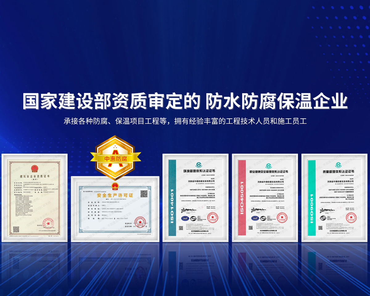 公司經營范圍:防水防腐保溫工程;消防設施工程;建筑裝修裝飾工程;建筑機電安裝工程;電力工程;建筑工程;石油化工工程;工業清洗工程;油罐清洗工程;鋼結構工程;環保工程;模板腳手架工程;電纜防火封堵、防污閃噴涂、外墻外保溫工程;各類施工勞務作業;設備維修、船舶鉚焊、涂裝;電力工程材料、建材、防水材料、防火材料、防腐保溫材料銷售,并相繼通過了GB/T19001-2008idtISO9001:2008GB/T50430-2007質量管理體系認證證書。GB/T24001-2004idtISO14001:2004環境管理體系認證證書。GB/T28001-2011idtOHSAS18001:2007職業健康安全管理體系認證證書。公司是中國防腐蝕于防護協會、中國施工企業管理協會、電力協會和中國鋼結構防水協會會員單位。 公司的經營業務涵蓋了石油、化工、電力、冶金、煤炭、船舶、國防、燃氣、水利、環保、交通運輸、航空及國防軍工和輕紡市政等行業的防腐保溫絕熱設備。鋼結構安裝、防火、防水、金屬噴鍍、聚脲噴繪、陰極保護、防滲透堵漏、玻璃鋼及各種磚版材料襯里、橡膠襯里、煙氣硫和耐酸溶劑腐蝕等工程施工。公司連續十年榮獲“省市先進施工企業”“安全生產先進單位”“重合同,守信用企業”和“AA***資質企業”的稱號。2000年被命名為市級文明單位,2002年被國家工商行政管理局命名為“重合同,守信用的企業”、被中國工業防腐蝕技術協會命名為“防腐蝕企業,能源節約及環境保護領域有豐富的經驗和***的業績。工程一次交驗合格率100%。其中攀枝花鋼鐵公司煉鐵廠四號高爐及熱風爐防腐工程、上海寶鋼公司煤氣柜防腐工程、撫順石油一廠裝置防腐項目、齊魯石化公司稀烴廠高塔防腐工程、吉林化學工業公司煉油廠油罐防腐工程、天津石化熱電廠六號爐頂棚聯絡管保溫工程、大慶油田(太倉)力神泵業工程、中國化學工程第十一建設工程、中原油田勘探局工程、中國石化銷售有限公司華北分部、魯皖輸油管道工程、貴州開磷息烽合成氨工程、陜西黃陵煤化工程、中國石油天然氣西部管道塔里木輸油工程、邯鋼集團邯寶鋼鐵公司煉鐵工程、德州供電工程、吉寶(南通)船廠工程,偃師華潤熱力工程、鄭州熱力總公司。 河南省中惠防腐安裝有限公司愿以豐富的施工經驗,***的技術,***的設備,***的管理,***的服務,竭誠為國內外廣大的用戶提供***滿意、******的工程作品。 我公司愿與國內外同仁一道,團結協作,共同推進防腐蝕行業發展! 公司地址:河南省長垣縣建設路北段360號 固定電話:0373-8866488 郵編:453400 網址:http://www_zhff_com_cn.990527.com